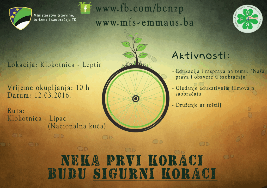 Poziv medijima Doboj Istok, 11. mart 2016. – Međunarodni forum solidarnosti EMMAUS u saradnji sa Ministarstvom trgovine, turizma i saobraćaja Tuzlanskog kantona organizirat će u subotu 12. marta biciklijadu pod nazivom «Neka prvi koraci budu sigurni koraci» na ruti Klokotnica – Lipac za mlade volontere iz Dobojske regije, a pridružit će im se i […]