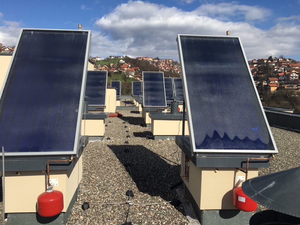 Sarajevo, 10. mart 2016. – U sarajevskom naselju “Miljacka” na jednoj od novoizgrađenih zgrada postavljeni su solarni paneli pomoću kojih svi stanovi na zadnjoj etaži imaju besplatnu toplu sanitarnu vodu. Ovo je prva stambena zgrada u Sarajevu koja na ovakav način koristi solarnu energiju kao alternativni izvor.