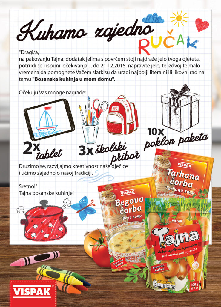 Uskoro nova Vispakova edukativno-zabavna akcija za cijelu porodicu:«Bosanska kuhinja u mom domu» Vispak je ovih dana priredio puno iznenađenja za ljubitelje bosanske kuhinje. Tajna dodatak jelima s povrćem, Begova čorba, Tarhana, Sarajevska i drugi delikatesi bosanske kuhinje naći će se u središtu pažnje. Cilj novog edukativno – zabavnog projekta je Vispakove začine, čorbe i […]