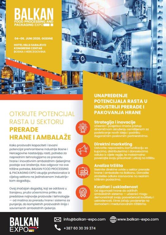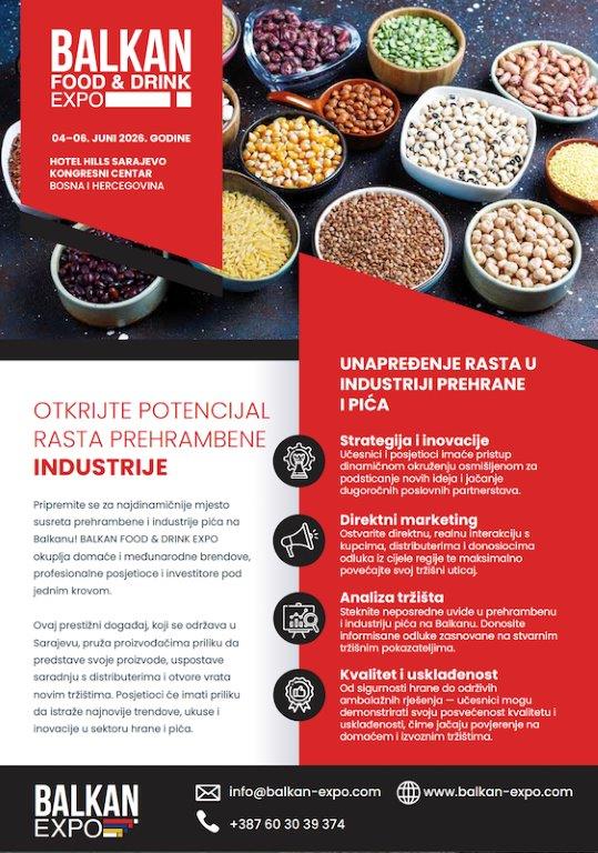 Sarajevo, 22. april 2026. – Bosna i Hercegovina ove godine postaje regionalni centar prehrambene industrije. U Sarajevu će se od 4. do 6. juna 2026. godine održati “Balkan Expo 2026”, do sada najveći i najznačajniji sajam hrane i pratećih industrija u zemlji.